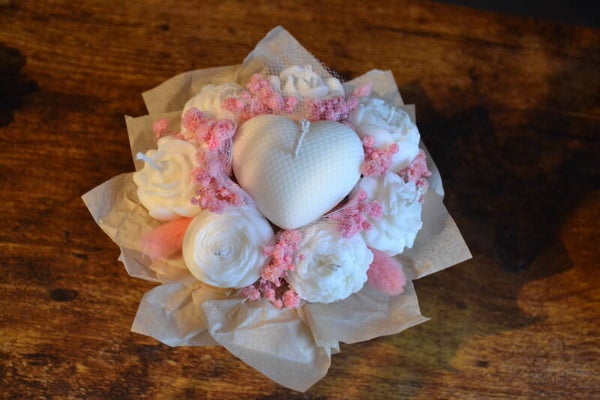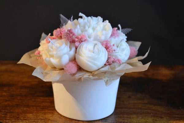 Material: Bio Sojawachs, Gießkeramik, Trockenblumen (Lagerus und Schleierkraut) natur oder eingefärbt