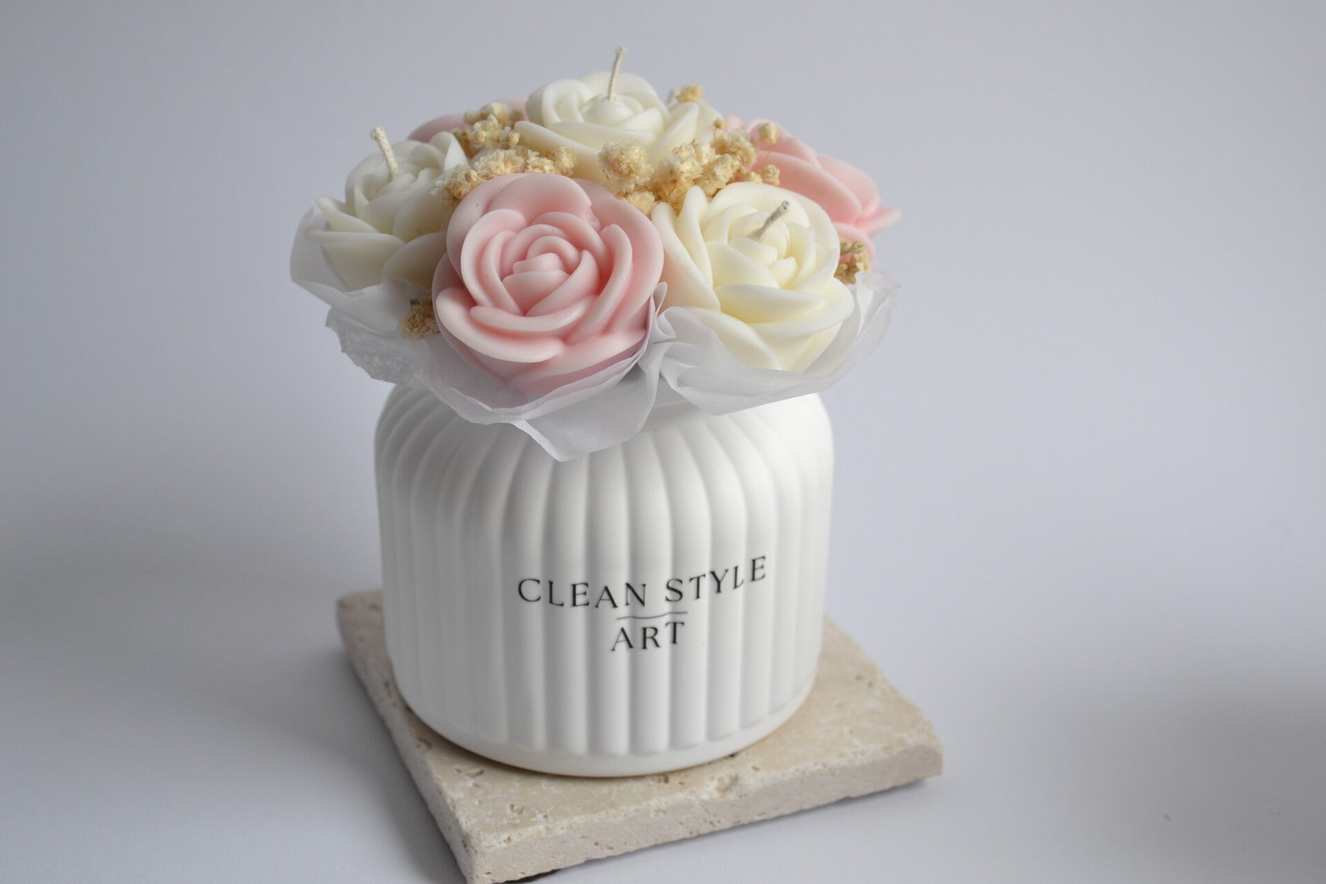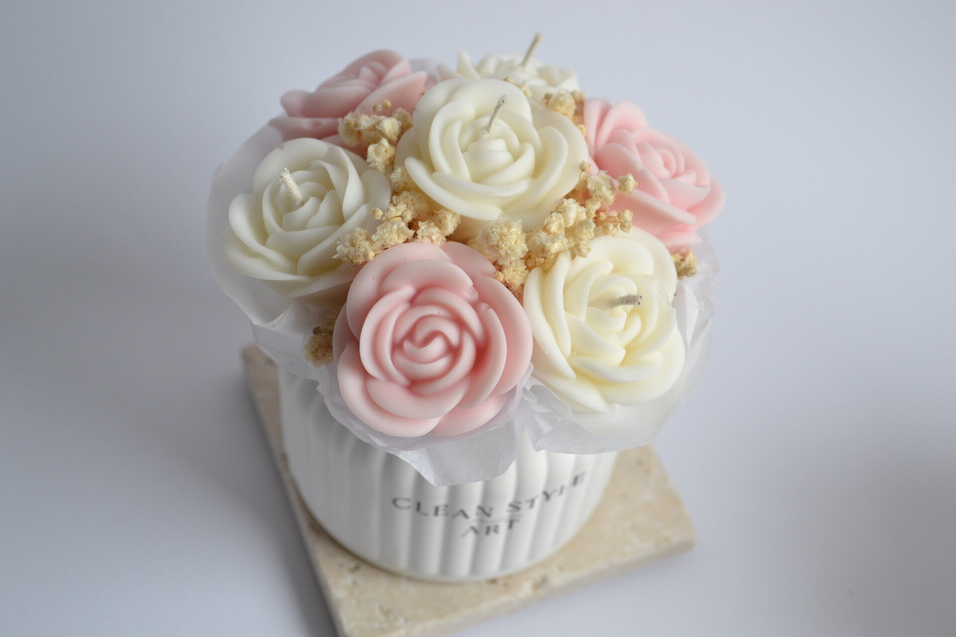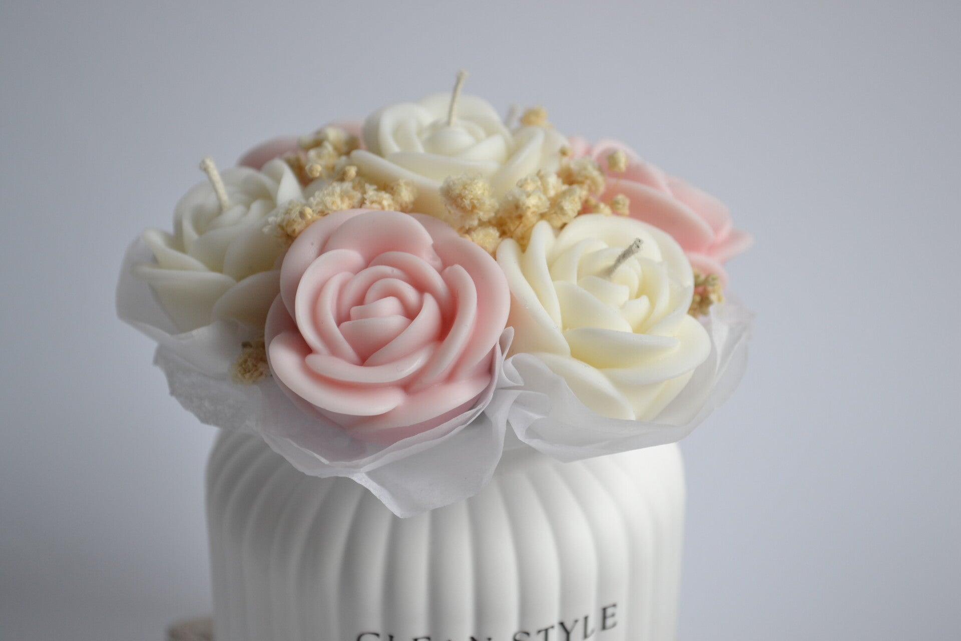 Das Kerzenbouquet ROSÉA vereint zarte Rosenkerzen mit feinen Trockenblumen zu einem stilvollen Arrangement.