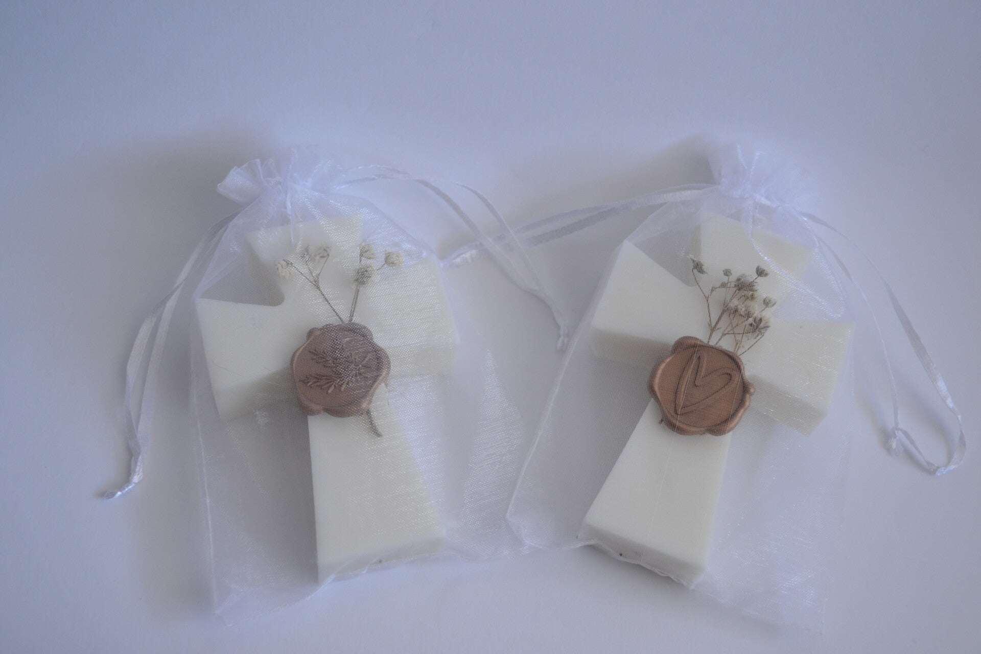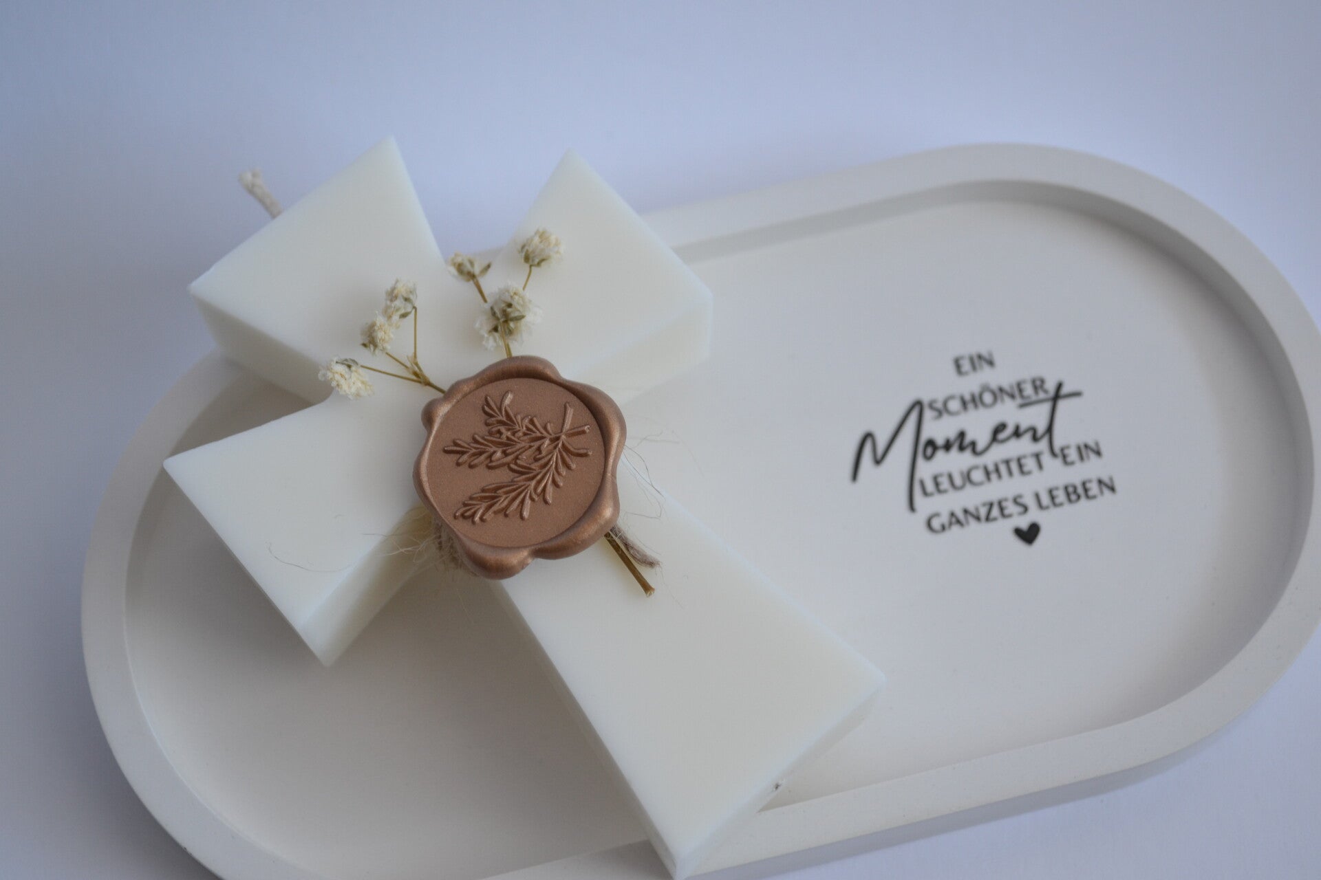 Die Kreuz Kerze aus Bio-Sojawachs wird in liebevoller Handarbeit gefertigt, mit feinen Trockenblumen veredelt und mit einem Kunstsiegel versehen.
